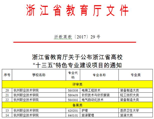 4月25日,浙江省教育厅公布了浙江省高校“十三五”特色专业建设项目,我校电梯工程技术、针织技术与针织服装、电气自动化技术、护理、旅游管理等5个专业再获立项。至此,我校共有12个专业入选为浙江省“十三五“优势特色专业建设项目,凸显了学校的办学优势和特色。