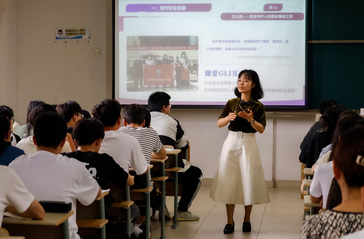 本季“优质课堂”公开课由马克思主义学院林玲老师主讲,课程《思想道德与法治》,单元任务为“投身崇德向善的道德实践之恪守职业道德”,课堂教学结构化设计逻辑清晰,组织严密,起承转合自然流畅,兼顾课堂效率和逻辑的和谐统一。从五一假期的人从众引入黄山守松人案例,结合学生汇报抛出开放性话题并引发讨论,进而导入课堂主题,以“是什么,怎么看,怎么做”为逻辑主线,按照概念讲解、问题思考、案例展示、教师点评、GLI讨论、学生观点输出、教师总结、知名校友视频现身解说的步骤组织课堂,层层递进,秩序感好,具有较强牵引力。教学内容紧密结合学生所在食品专业,所学食品内容,学生代入感和体验感真实而强烈,有效激发学生职业道德感。从食品行业的杰出人物案例展示到食品专业的教师案例、学生案例、校友案例直至食堂师傅的案例,由远及近,由高到底,全方位立体式给予学生正向职业道德价值观的浸润和冲击。课堂教学方法新颖、形式多样,课堂教学结合了问题教学、GLI讨论、学生汇报、学习通词云展示、案例视频展示和教师讲授等多种教学方法和信息化手段,注重课堂互动质量与机会的均衡,学生回答问题的质量较高,各类方法的运用熟练而巧妙,有效提升课堂效果和教学质量。林玲老师以身示范,备课十分用心,为准备优秀校友案例视频等课堂资料,花费大量时间精力,力求精益求精,上课充满热情,语言感染力强,亲和力突出,与学生关系融洽,课堂氛围积极向上,学生上课非常投入,向在座听课教师和学生正面展示了新时代高校思政课老师职业道德的真实案例。