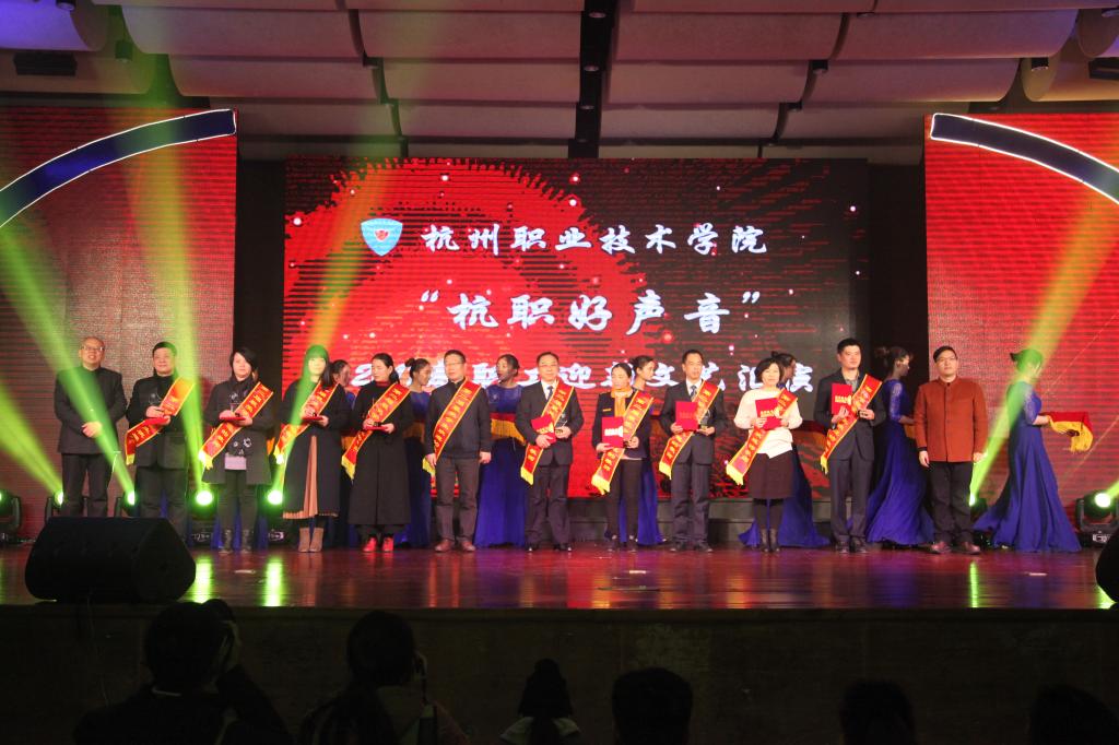 12月28日下午,我校在图书馆报告厅举行2017年教职工迎新文艺汇演暨“杭职好声音”总决赛。学校党政领导班子成员安蓉泉、贾文胜、张洪宪、许淑燕、陈泉淼、陈加明、金徐伟共同上台,用电子按钮开启汇演序幕并致新年贺词。