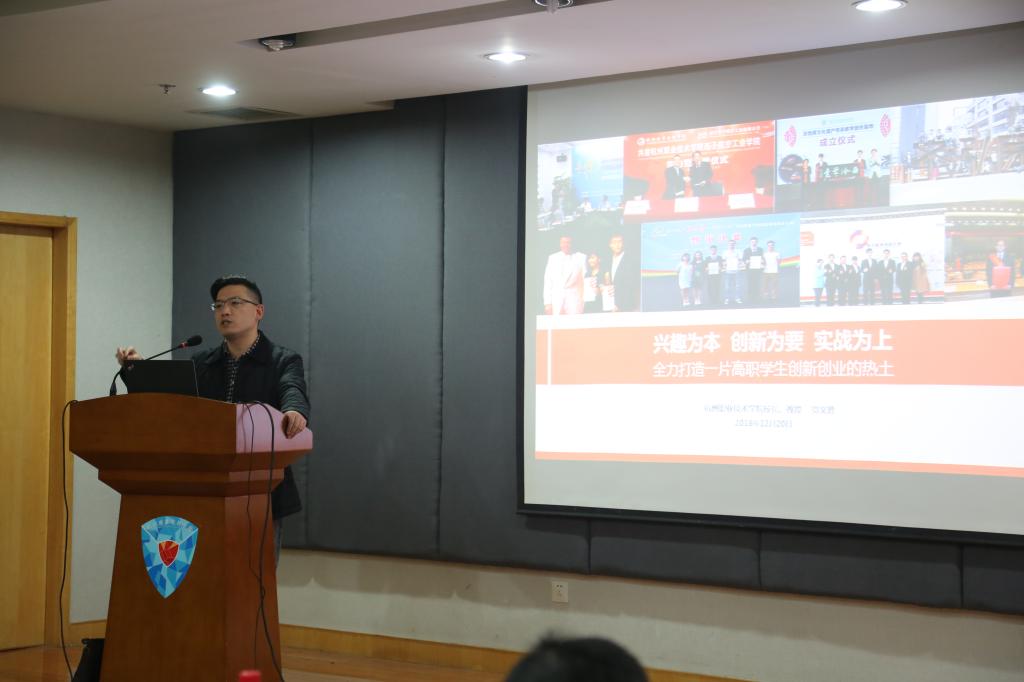 校长贾文胜以“兴趣为本、创新为要、实战为上,全力打造一片高职学生创新创业的热土”为题,作创新创业教育专题讲座。他分析了我国大力推进创新创业教育的时代背景,辨析了创新教育与创业教育的各自目标,并详细解读了践行三大理念、完善四阶段体系、培育三支队伍、整合三类资源的“3433”创新创业教育改革模式。