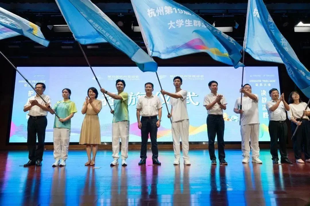 机关党委书记、校工会副主席何霞红作动员领誓。校团委副书记楼黎瑾代表教师领队、达利女装学院桑怡婷同学代表全体志愿者、商贸旅游学院院长张赵根代表二级学院,宣传部部长张杰、保卫部部长郑何敏代表职能部门依次作了表态发言。他们表示,将全力贯彻落实上级要求,牢记担当、不辱使命,高标准、高质量完成各项任务,齐心协力为护航杭州亚运会、亚残运会交出一份完美的答卷。动员大会上还举行了全体志愿者授旗仪式。数位杭州亚运会开幕式学生演员代表一同唱响杭州亚运会主题曲《同爱同在》。