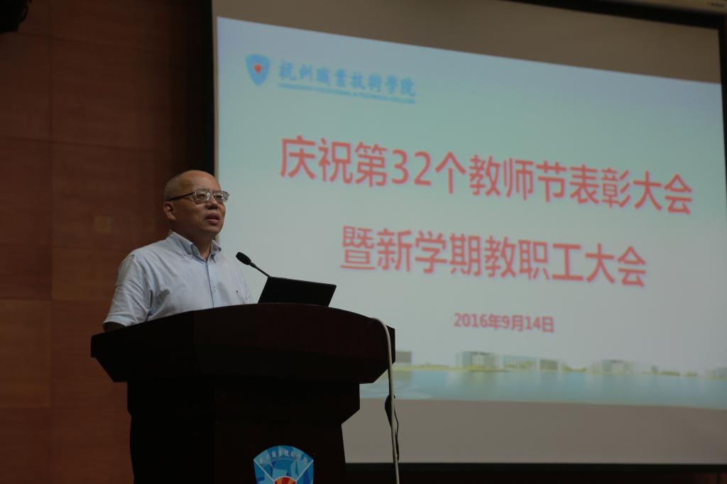 9月14日下午,我校在图书馆报告厅召开庆祝第32个教师节表彰大会暨新学期教职工大会。学校党政领导班子成员、全体教职工出席大会。