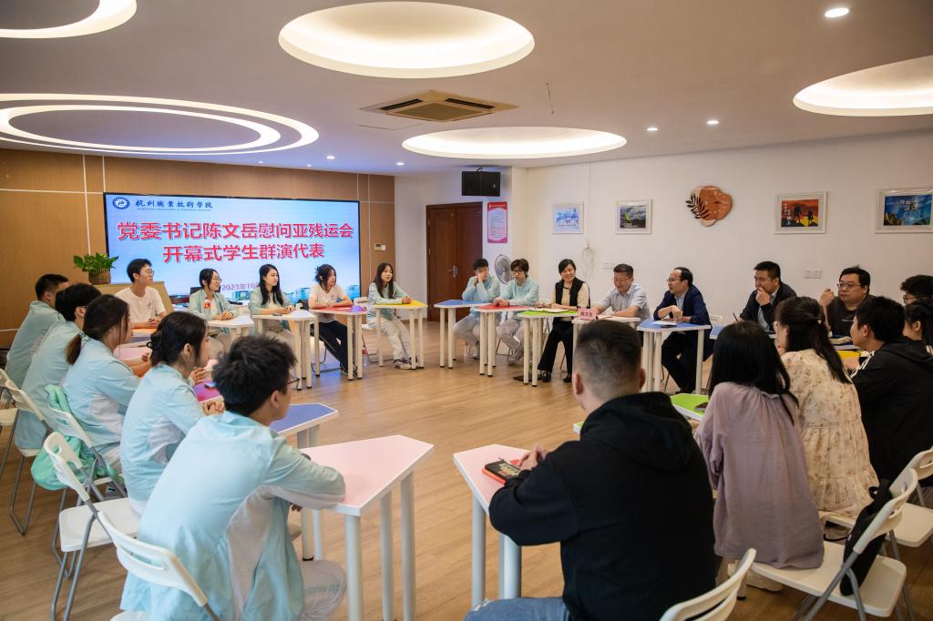 10月19日,校党委书记陈文岳在学生活动中心309心理团辅室慰问我校杭州亚残运会开幕式群演学生代表并送上慰问品,学工部负责人陪同参与慰问。