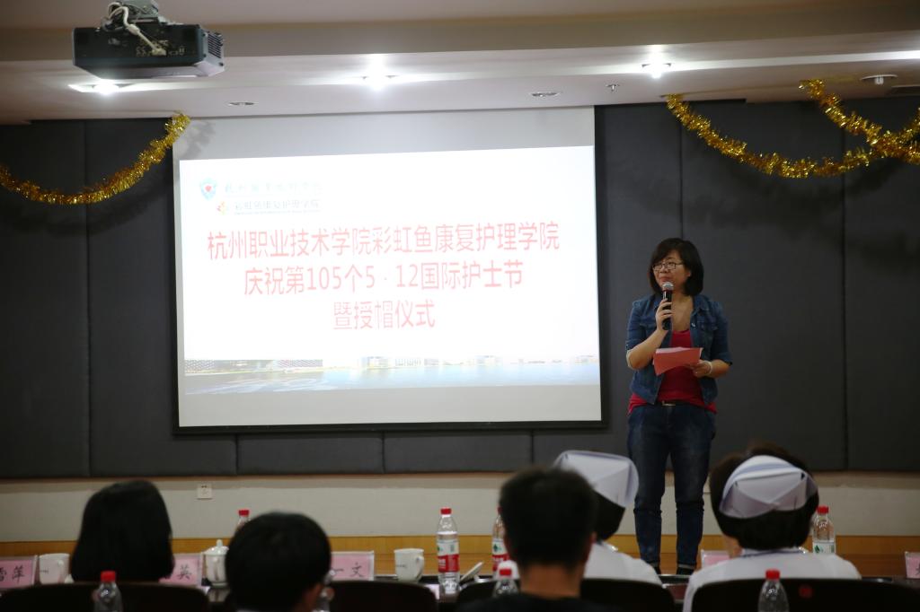 为迎接第105个“5·12”国际护士节到来,弘扬南丁格尔无私奉献、救死扶伤的人道主义精神,5月11日下午,彩虹鱼康复护理学院举办“庆祝第105个5·12国际护士节暨授帽仪式”。校党委副书记赵一文,校团委、继续教育学院、彩虹鱼康复护理学院相关负责人出席。活动邀请了原浙江大学附属第一医院护理部主任邵爱仙、杭州师范大学钱江学院护理分院院长陈雪萍、原浙江大学附属第二医院护理部主任任蔚虹、浙江大学附属邵逸夫医院护理质量科护士长潘红英4位护理前辈为护生授帽。