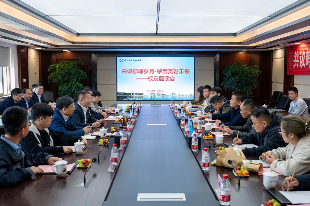 欢迎会后,学校举行了“共议峥嵘岁月·擎启美好未来”座谈会。程利群介绍了新校区建设的整体情况,校友代表表达了对杭职院时光的感想感悟。陈加明分享了自己在杭职院26年学习工作的感受,他表示自己会持续关注学校发展,对学校取得的骄人成绩倍感振奋,他相信学校坚持类型发展,持续深化校企合作、产教融合、科教融汇,一定能打赢“三大攻坚战”任务。与会的校友代表还围绕新校区建设、实训基地建设、设备设施改善、提升人才培养质量等方面提出了宝贵意见建议。听了校友代表的分享发言后,陈文岳指出,校友们返校交流充分印证了学校与校友之间相互促进的紧密关系,学校感谢校友们对学校高质量发展提出的宝贵意见,他要求参会部门对每一条建议逐条进行梳理分析并及时反馈,切实发挥校友返校日集众智、聚合力的积极作用。