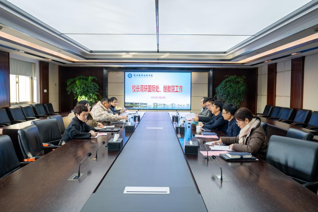 徐时清就扎实推进国际交流合作和继续教育工作提出三点要求,一是要守牢底线,在深化推进对外交流合作和社会服务过程中筑牢安全防线和廉洁底线。二是要拓展平台,着力建设在全省甚至全国具有一定影响力的国际交流合作和社会服务平台。三是塑造品牌,加快打造具有杭职特色和辨识度的国际化办学品牌和社会服务品牌。