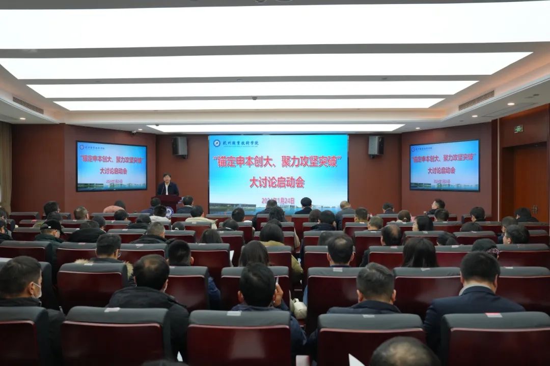 冬日钱塘,乍暖还寒。1月24日,当大多数学校都已处于寒假期间时,一场题为“锚定申本创大、聚力攻坚突破”大讨论启动会在杭职院内火热进行。学校领导班子成员、全体中层以上干部、高职称代表、党外人士代表等近百人参加。大家一道学政策、厘思路、聚合力,着力为学校申本创大目标谋求突破。