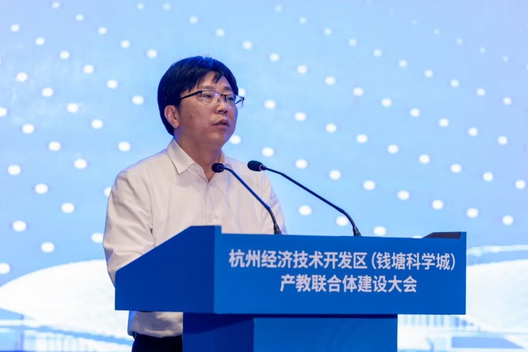 周妙荣在致辞中充分肯定了经济技术开发区(钱塘科学城)产教联合体前期建设取得的成效,指出建设大会的胜利召开,将在更大范围、更广领域、更高层次上实现政校企互惠共赢,赋能钱塘全域发展。他希望全区各职能部门进一步创新产教融合机制模式,继续搭建合作桥梁、优化服务环境,积极营造产教融合共赢氛围;希望联合体内各高校、科研院所,主动贴近产业、靠近行业、融入企业,做好教育链、做强科研链、做优人才链,与企业联合培养输送优秀人才,反哺产业能级提升;更希望更多企业加入联合体建设,着眼产业发展未来、行业发展现状、企业发展实际,与高校和科研院所多联系、早布局、利长远、谋共赢。