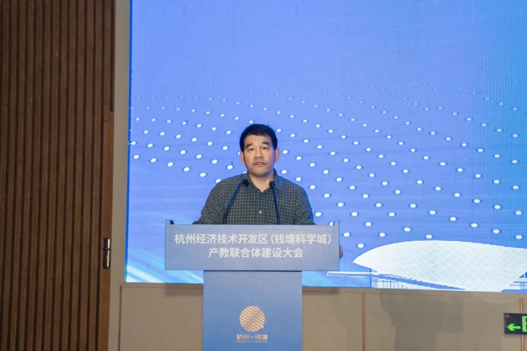 3月29日下午,杭州经济开发区(钱塘科学城)产教联合体建设大会在钱塘区国际创博中心隆重召开,浙江省教育厅职成教处处长陈达,杭州市委教育工委专职副书记、市教育局党组副书记陈萍,钱塘新区党工委委员、区委常委周妙荣,钱塘区人大常委会副主任李红,我校校长徐时清,科学城管理办公室党工委副书记、常务副主任谢国锋,钱塘区产业集团党委副书记、董事、总经理苏凡等钱塘区政府相关职能部门领导、联合体内高校、科研机构、企业代表100余人参加会议,会议由我校副校长楼晓春主持。