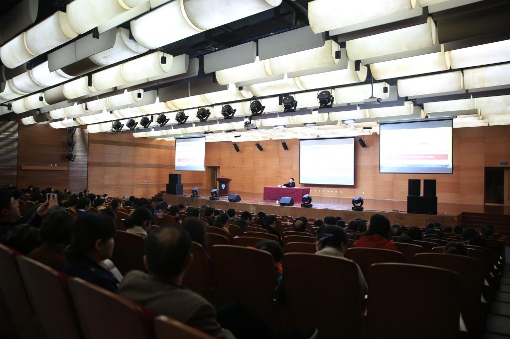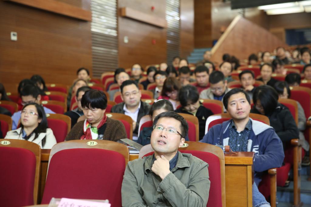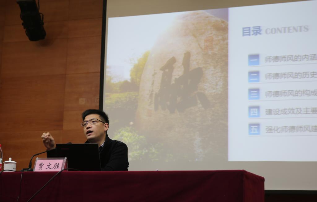 贾文胜从解文说字切入,分析了“师”、“德”、“风”这三个字的内涵,从历史的角度阐述了孔子、孟子、朱子、韩愈等儒家代表对师德师风的概括和对教师的要求。在引经据典的同时,将这些大师们的观点与当今的社会现实相结合阐述了他自己独到的见解。他从近代以来的师德师风教育讲到了习近平总书记对教师的殷切希望。他回顾了自己从事教育事业一路走来的感悟,以谦虚的态度,生动典型的案例,朴实而富于感染力的语言分析了师德师风的构成要素,并总结回顾了我校近年来在先进师德师风建设中涌现出的大批师德先进典型,也剖析了目前教师在师德师风方面存在的问题。