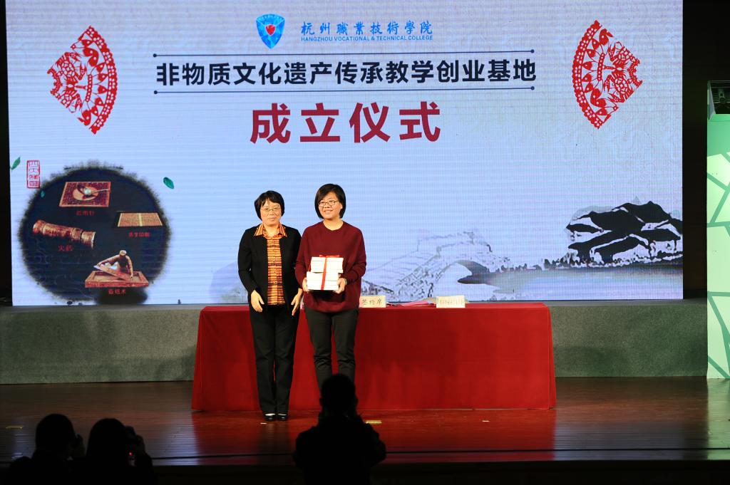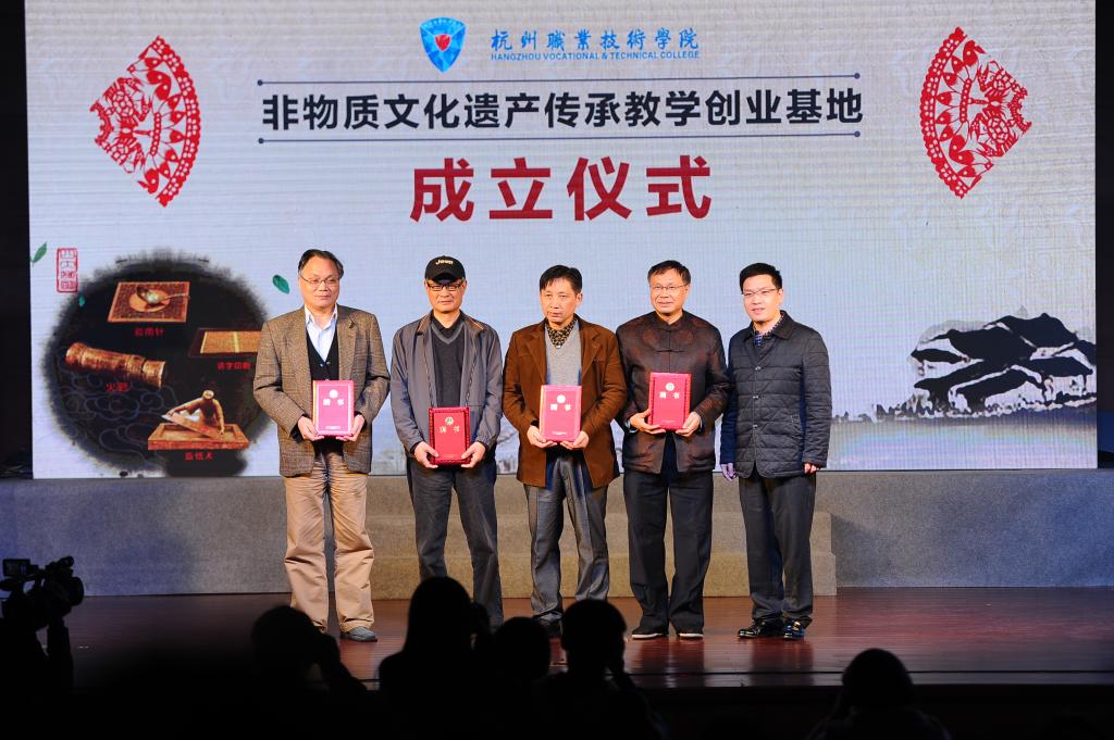 “杭州职业技术学院非物质文化遗产传承教学创业基地”坐落于我校学生活动中心,该基地占地约600平方米,首批引进了西泠印社金石篆刻(人类非物质文化遗产)、雕版印刷技艺(国家级非物质文化遗产)、中式旗袍制作技艺(国家级非物质文化遗产)、纸伞制作技艺(浙江省非物质文化遗产)、全形拓技艺(杭州市非物质文化遗产)等五个项目。五个项目的代表性传承人刘江、黄小建、闻士善、屠燕治、韩吾民都分别在我校开设“大师班”,正式收徒授课。