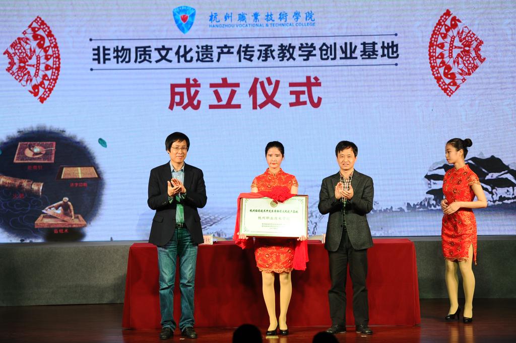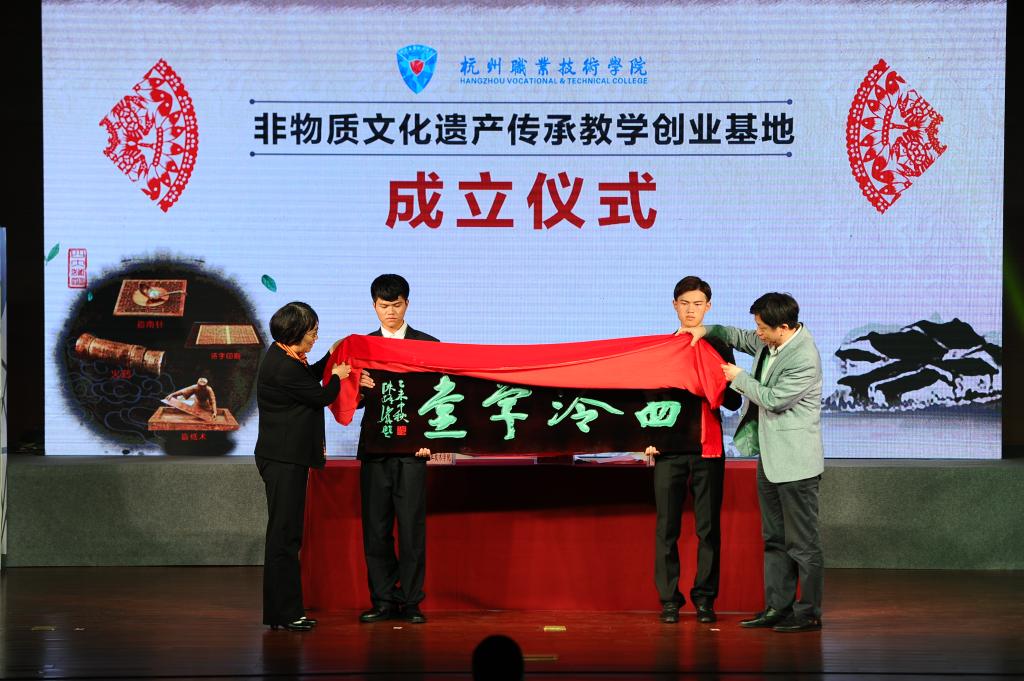 11月11日,杭州职业技术学院非物质文化遗产传承教学创业基地在我校正式挂牌成立。杭州市副市长陈红英,杭州市委宣传部常务副部长、西泠印社党委书记、西泠印社社委会主任杨志毅,浙江省非遗保护中心主任裘国樑等领导,“非遗”传承人刘江、黄小建、闻士善、屠燕治、韩吾民,以及我校党委书记安蓉泉、校长贾文胜等人出席基地成立仪式。