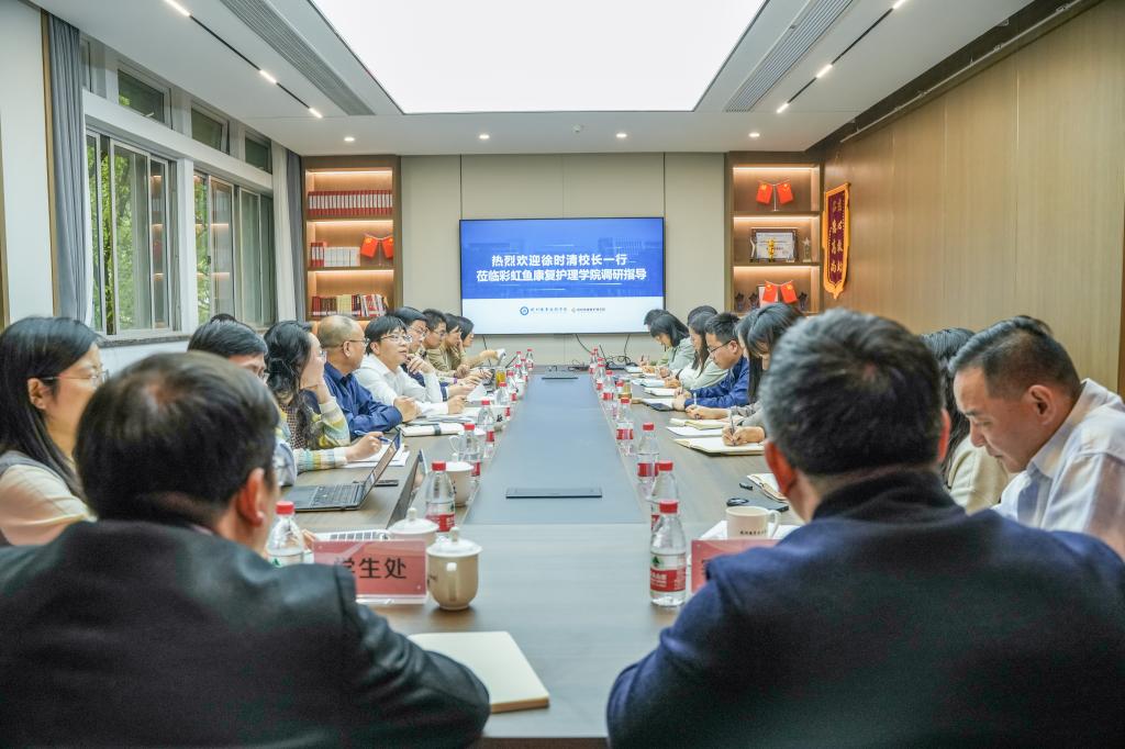 4月19日下午,校长徐时清带队调研彩虹鱼康复护理学院,党委副书记赖明诚,副校长袁俊陪同调研。