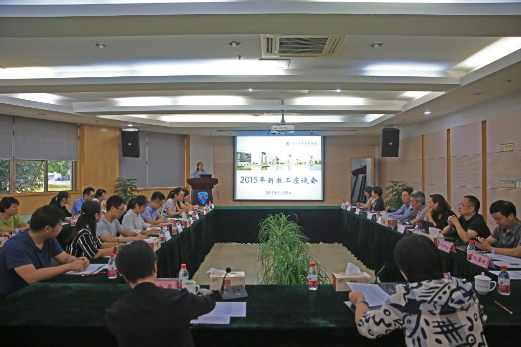 为更好地服务新入职教工,加强对新入职教师成长成才的支持,人事处于9月28日下午组织召开 2015年新教工座谈会。校党委副书记赵一文、副校长许淑燕、副校长陈加明,与新入职教工齐聚一堂,聆听心声,为新入职教工加油鼓劲。科研处、教务处、学工部以及工会、后勤等部门负责人出席座谈会。与会人员除了新入职教工外还有三位优秀教师代表。会议由人事处副处长叶青青主持。