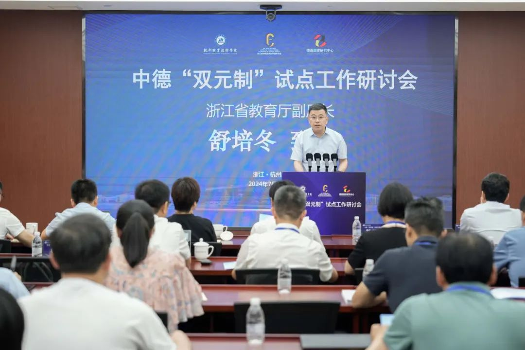 7月5日,浙江省中德“双元制”试点工作研讨会在我校成功举办。浙江省教育厅副厅长舒培冬、我校校长徐时清出席会议并致辞。本次活动由浙江省教育厅主办,杭州职业技术学院和浙江省中外合作办学研究中心共同承办,浙江科技大学德语国家研究中心协办。来自全省13所“双元制”试点院校的分管校领导、国际处负责人、“双元制”工作具体负责人等50余人参加研讨会。省教育厅国际合作与交流处处长蓝晶晶主持会议。