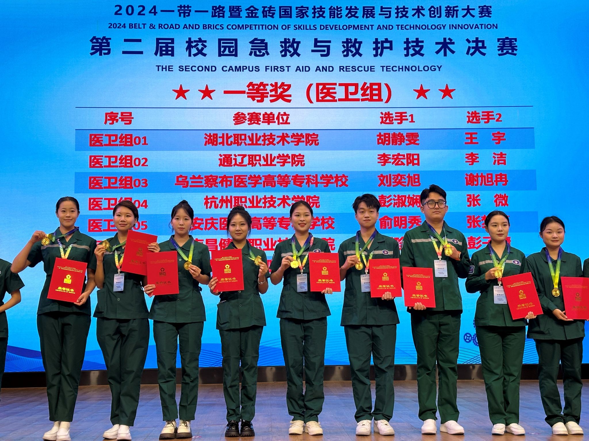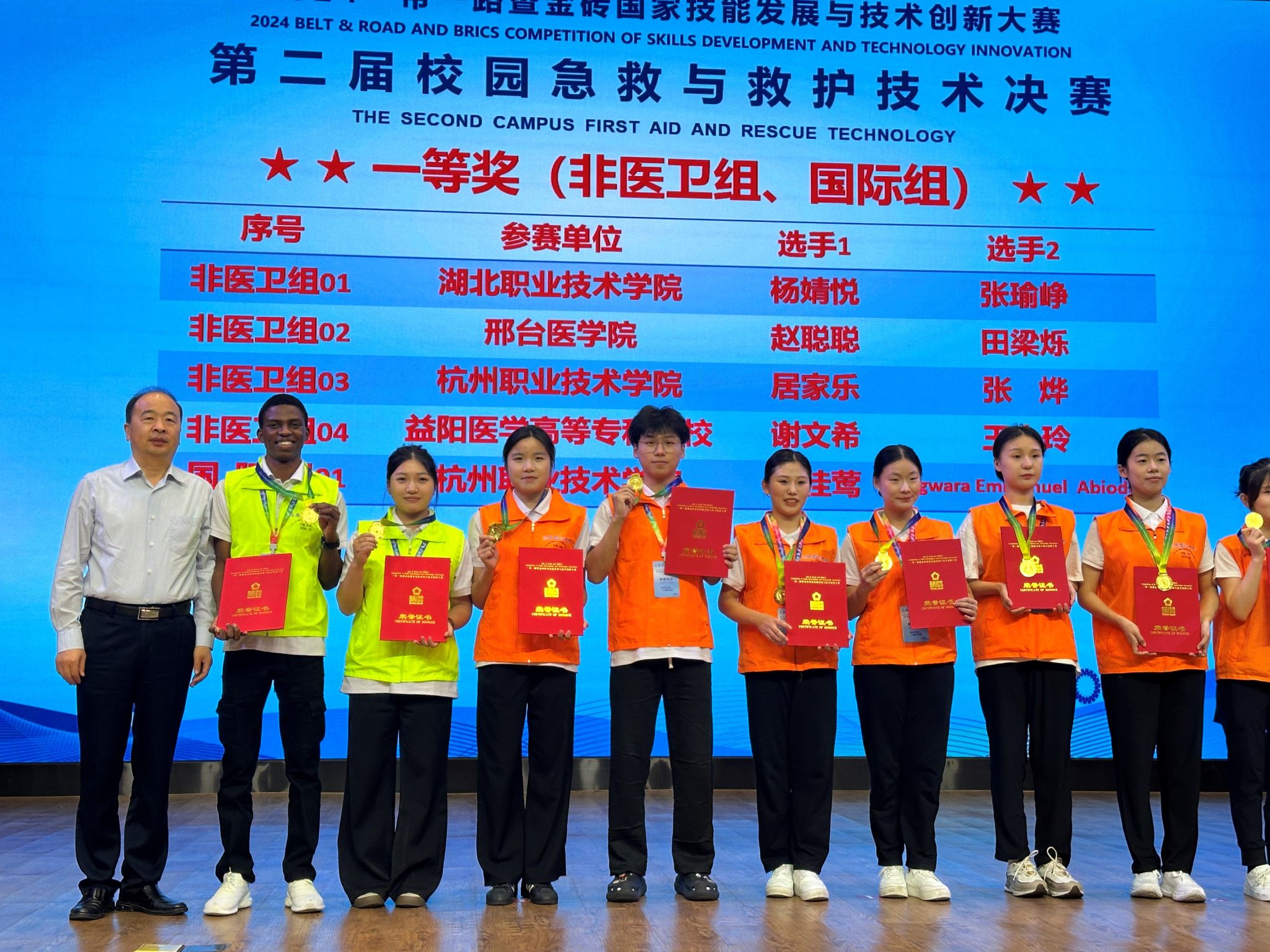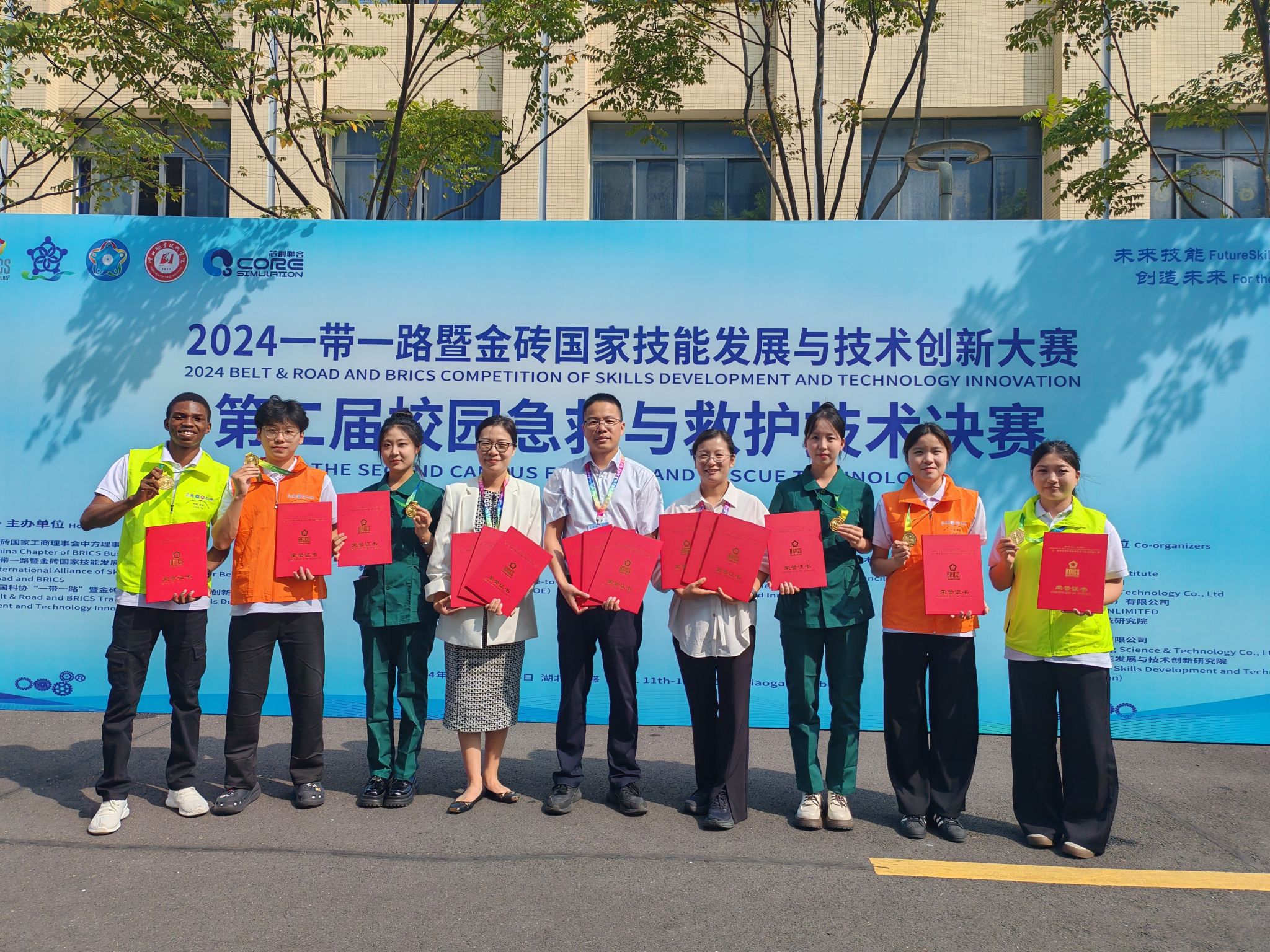 金风飒飒,硕果累累。10月14日,2024一带一路暨金砖国家技能发展与技术创新大赛第二届校园急救与救护技术赛项决赛现场传出捷报,我校彩虹鱼康复护理学院喜获“医卫组”、“非医卫组”和“国际组”三项一等奖,并荣获最佳组织奖。