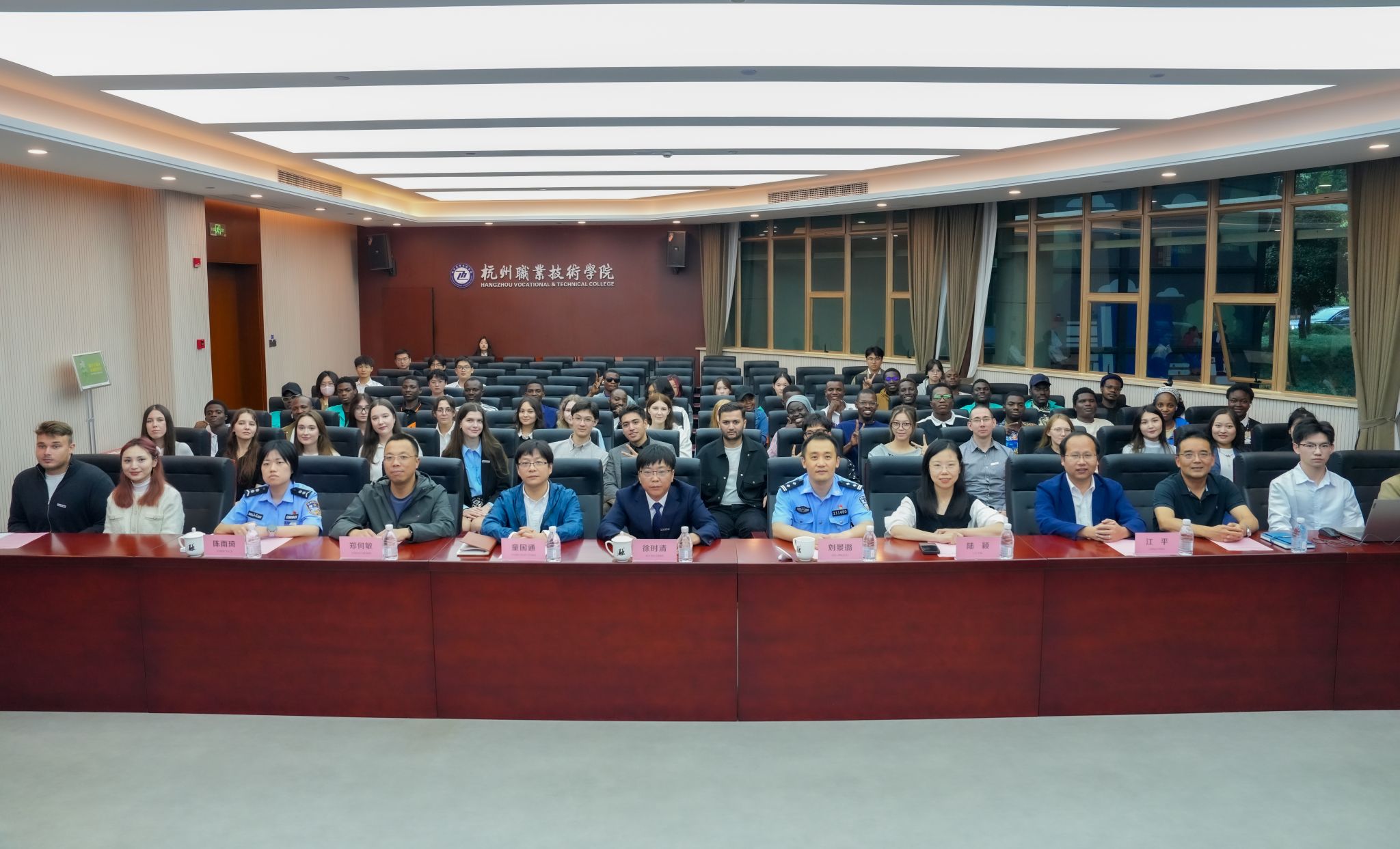 典礼现场,校长徐时清还为留学生代表佩戴了杭州职业技术学院校徽,为他们送上了校长的关心与祝福,并与全体学生合影留念。