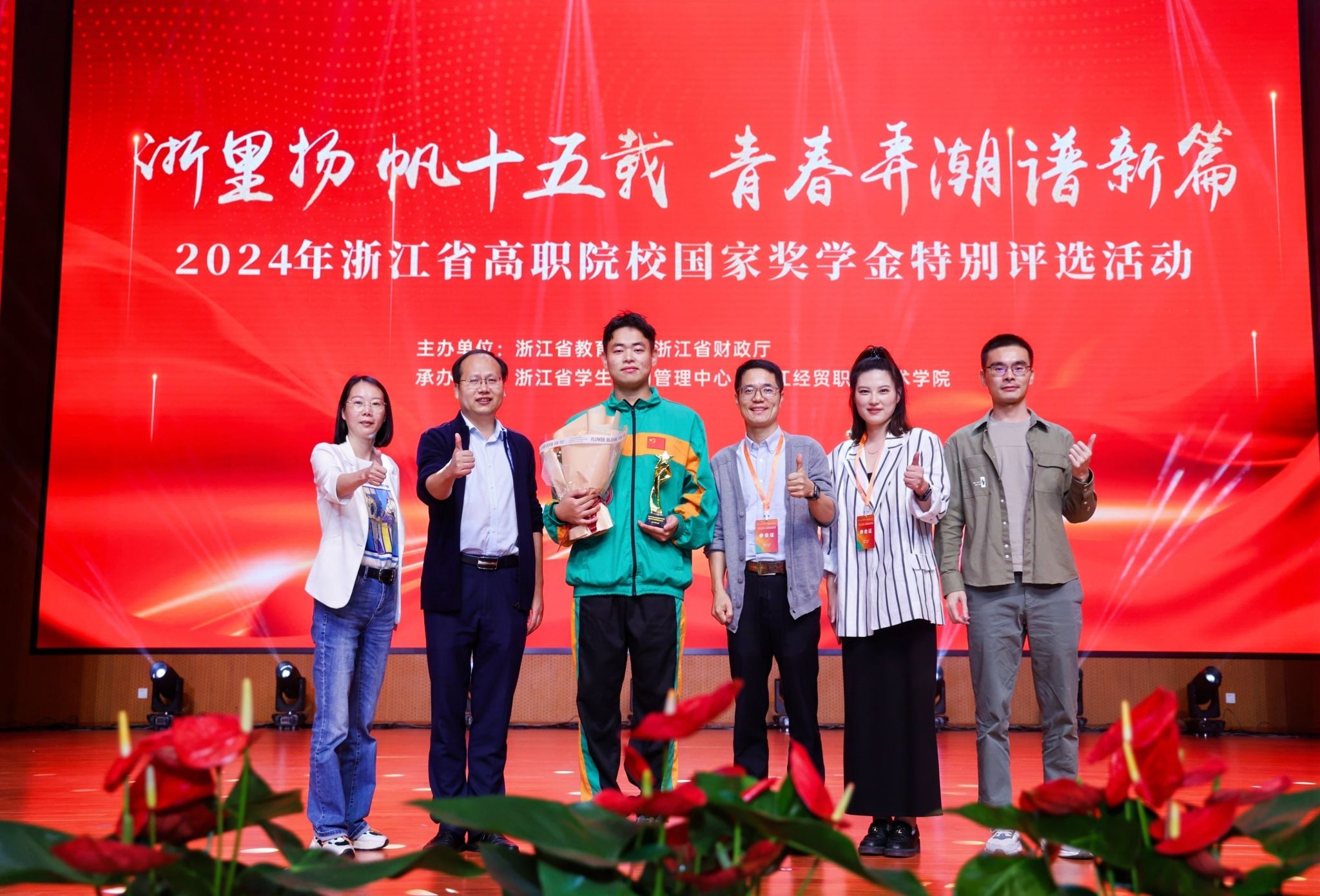 冯承骁通过视频展示、个人陈述等环节,讲述自己骁勇追梦、技能报国的成长轨迹和心路历程,谱写了奋发有为的青年篇章,彰显了昂扬向上的青春风采,展示了生机勃勃的青春力量,最终在15名候选人中脱颖而出,斩获2024年浙江省高职院校国家奖学金特别评选推荐资格。这也是我校连续第三年斩获该奖项,是我校资助育人的重要成果。