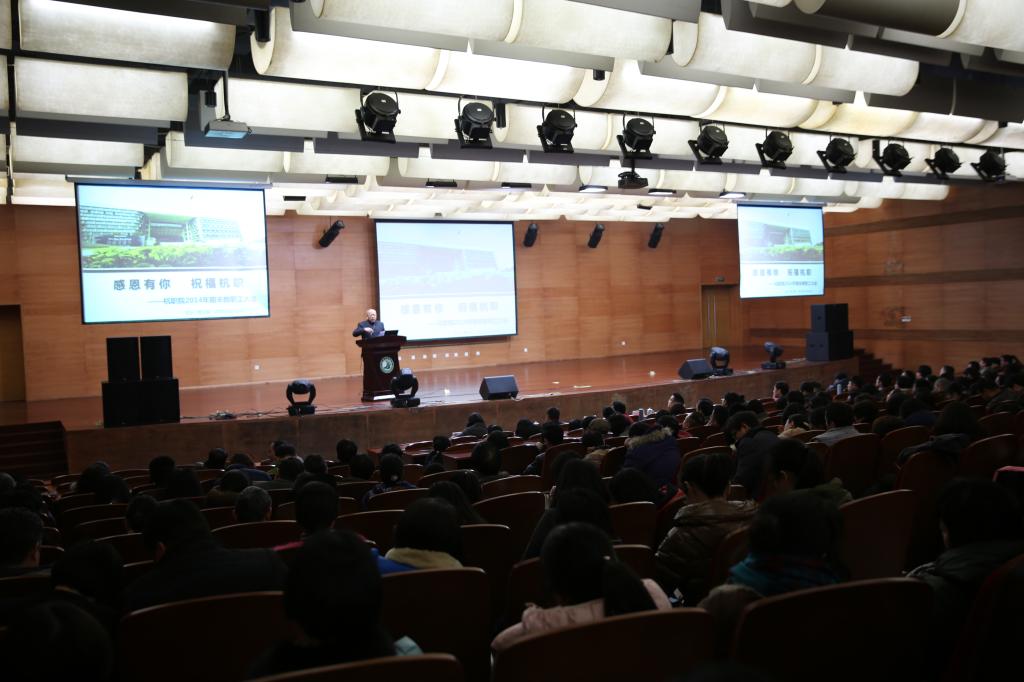 随后,党委书记安蓉泉作了总结。他回顾了学校2014年发生的几件大事,如学生公寓含晖苑E北区成功回购、电梯实训基地落成并启用、西子航空工业学院成立、第一次党代会顺利召开等。此外,学校在文化梯度育人、混合所有制、现代学徒制等方面进行了积极地探索和创新,引起了各级领导的重视和社会各界的关注。安蓉泉解读了这些重要事件,对于背后所蕴含的杭职人抓住机遇、开拓创新、甘于吃苦、敢于担当的精神给予了充分肯定。他希望全校师生员工在新的一年里以更加坚定的信心、更加振奋的精神、更加务实的作风投入工作、学习中,全力以赴推进学校事业的发展。最后,安蓉泉也代表学校党政班子,对全校教职工一年来的辛勤付出表示了衷心的感谢,祝福教师们假期生活快乐,羊年吉祥安康。