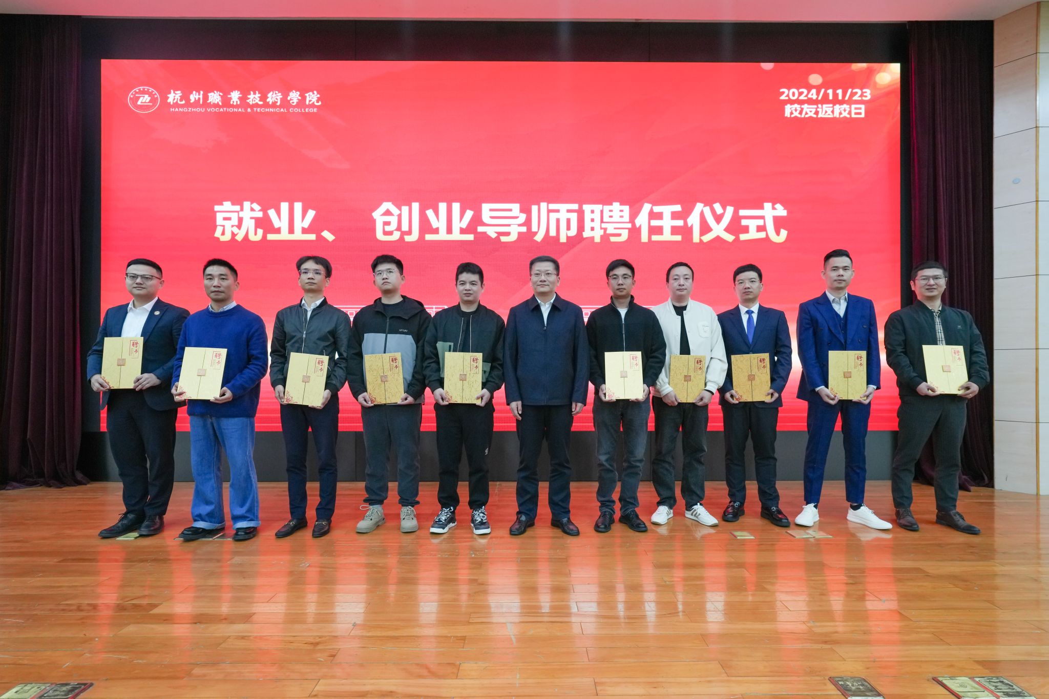 冬日暖阳,银杏树下,11月23日,杭州职业技术学院一年一度的校友返校日如期举行。来自四面八方的校友们回到母校,参加“启航新征程,共筑杭职梦”校友返校活动,共同回顾往昔岁月,展望美好未来。校党委书记陈文岳,党委委员、副校长程利群,相关职能部门及二级学院负责人,以及300多名校友欢聚一堂。活动由程利群主持。