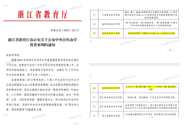 近日,浙江省教育厅公布了中外合作办学优秀案例名单(浙教函〔2024〕222号),我校《以文化之“魂”塑华服以“型”,以秀场之“靓”展国潮之“风” ——“工坊+秀场”职教出海新路径的创新实践》和《多跨协同模式下德国“双元制”本土化创新与实践》两个案例成功入选。本次评选共计确定51个中外合作办学优秀案例(其中高职22个)。