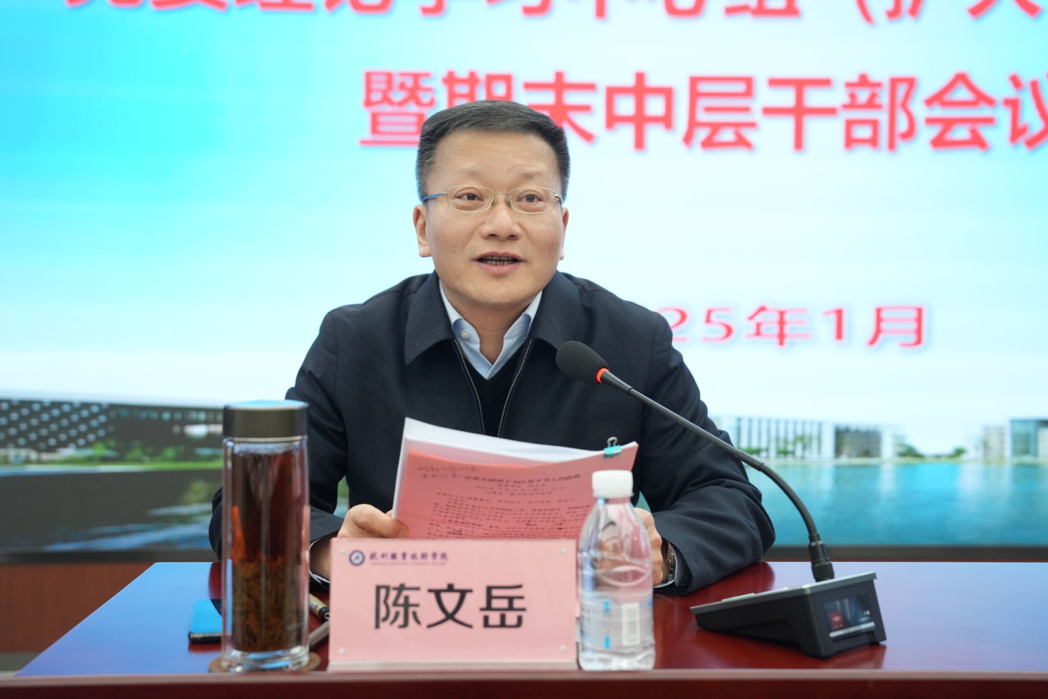 陈文岳在总结讲话中指出,过去一年,在广大干部和全体师生的共同努力下,党建引领各项事业精彩纷呈、拼搏奋进、创先争优,成绩的取得与广大干部特别能战斗、特别能吃苦、特别能付出密不可分。他强调,2025年是“十四五”规划收官之年、“十五五”谋划之年,也是落实学校第三次党代会发展目标的关键之年,广大干部提前思考和谋划如何将学校的改革发展任务与省市委重点工作紧密结合。他指出,立足当下、面向未来,学校要聚焦新质生产力背景下推动职业教育高质量发展,推进横向融通纵向贯通,成长道路更宽阔;推进专业深度对接产业,课堂衔接“职场”;推进产教融合往深处走,汇聚发展新合力,彰显更多“新”和“实”的新担当、新作为。他要求,广大干部要全面深入学、对标先进学、融会贯通学过程中往深里走、往实里走,当好先锋、当好表率,弘扬“六干”精神,奋力交出打赢学校“三大攻坚战”的高分答卷。