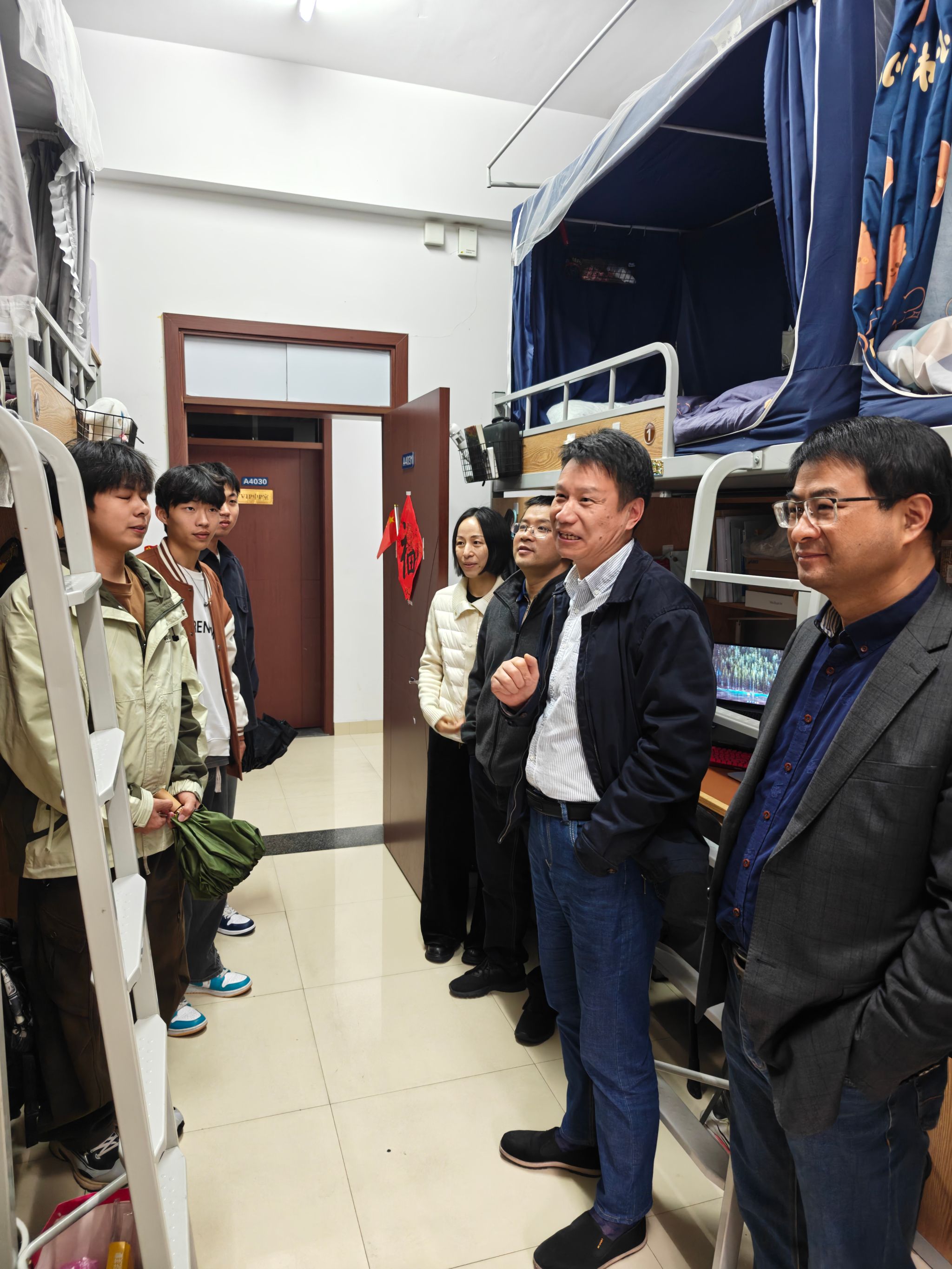午餐结束后,高云飞走进学生寝室,细致了解学生寝室生活情况。当看到整洁有序的寝室环境时,他对同学们表示肯定和赞扬。他特别鼓励作为退伍士兵的同学们,要继续发扬部队的优良作风,进一步加强寝室安全与文明。高云飞强调,“寝室是学风建设的最小单元”,希望同学们多读书、多培养有益的兴趣爱好,共同营造积极向上的宿舍氛围。