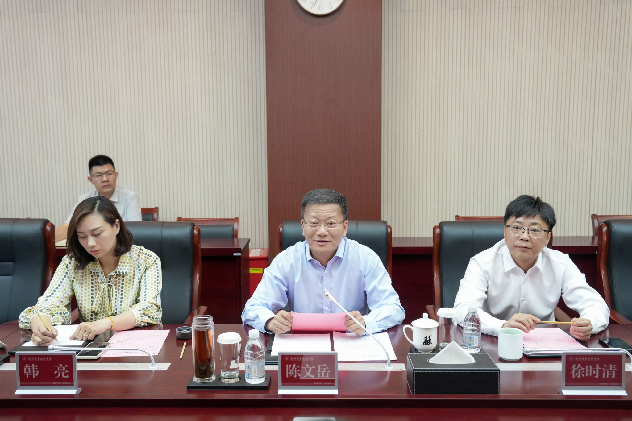 陈文岳简要介绍了学校的办学历史、基本情况以及在“双高”建设过程中的积极探索和特色成果。他指出,杭职院始终秉持“产教融合创新、科教融汇发展”战略,构建了校企协同育人新机制、产教双向赋能新格局、文化共生共荣新生态。徐时清就学校在双高建设、人才培养、社会服务等方面取得的办学成果进行了简要介绍。他表示,在杭州市委市政府的引导和支持下,学校紧扣高质量发展主线,呈现优质均衡、蓬勃发展的良好态势。接下来,学校将抢抓机遇,走深走实校企合作发展之路。