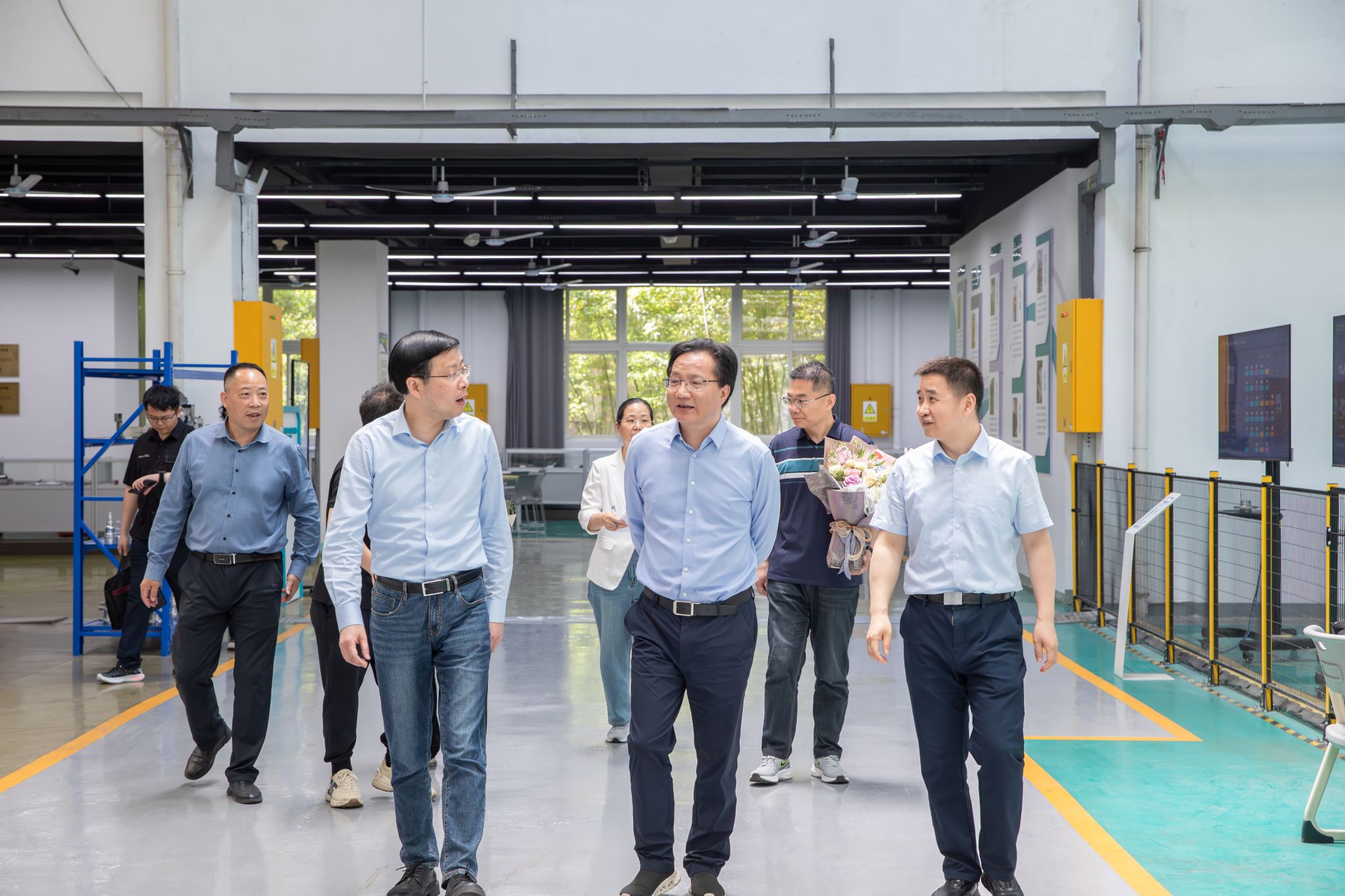 在友嘉智能制造学院,陈秋兴一行向全国劳模王斌俊、省劳模陈楚、市劳模王赟送上鲜花与节日慰问品,并亲切询问三位劳模的工作近况。随后,陈主任一行走进智能制造实训车间,实地观摩劳模团队研发的“智能生产线故障诊断系统”等教学成果。陈秋兴充分肯定了学校“以劳模带团队、以匠心育人才”的理念。此外,陈秋兴一行还参观了我校的校史馆和非遗馆。