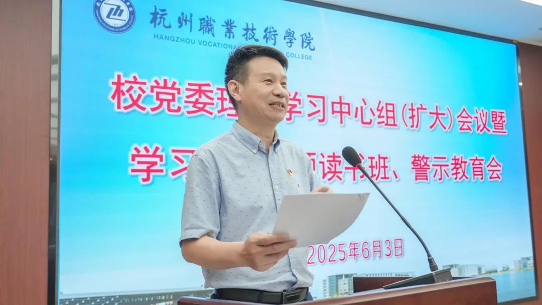 6月3日下午,杭州职业技术学院在行政楼 117 会议室召开党委理论学习中心组(扩大)学习会暨学习教育专题读书班、警示教育会,深入学习习近平总书记关于加强党的作风建设的重要论述和中央八项规定及其实施细则精神。在校党委领导班子成员、全体中层干部、“菁英计划”人员参加会议。市纪委监委驻市教育局纪检监察组副组长洪悬彬到场巡听旁听。校党委书记陈文岳主持会议。