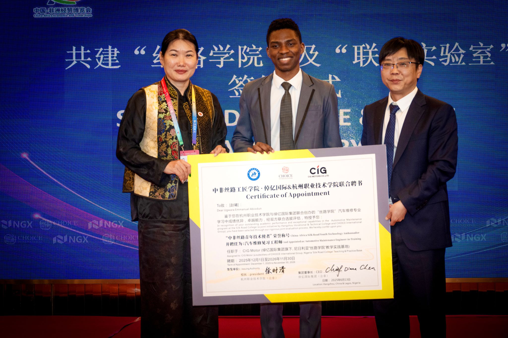 会上,我校中非(尼日利亚)丝路工匠学院留学生代表赵曦分享来华学习感言。徐时清和倬亿国际集团董事长、中非民间商会尼日利亚代表处首席代表陈秀霞为赵曦颁发“中非丝路青年技术使者"和ClG motor“汽车维修见习工程师"证书。