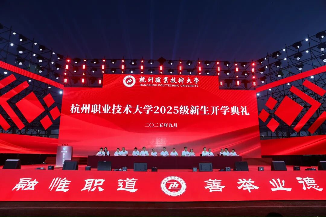 天高云淡,金桂飘香。9月26日晚,杭州职业技术大学2025级新生开学典礼暨迎新晚会在学校田径场拉开帷幕。学校师生齐聚绿茵场,共同见证专为新生们精心策划的璀璨夜晚,欢迎他们开启崭新的大学学习旅程。学校党委书记陈文岳,校长黄兆信等全体校领导班子出席,校友代表和各二级学院负责人在主席台就坐;相关职能部门负责人,全体辅导员、新生班主任和2025级新生一道参加。开学典礼由副校长邓劲莲主持。
