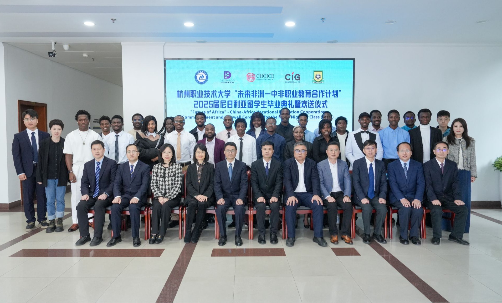 11月3日上午,我校“未来非洲-中非职业教育合作计划”2025届尼日利亚留学生毕业典礼暨欢送仪式隆重举行。杭州市教育局高等教育处(交流合作处)副处长蔡宇冠,浙非服务中心主任、中非民间商会副秘书长谢琪,倬亿国际集团人力资源总监林雯,我校校长黄兆信、副校长楼晓春及相关部门负责人、教师代表出席典礼仪式。
