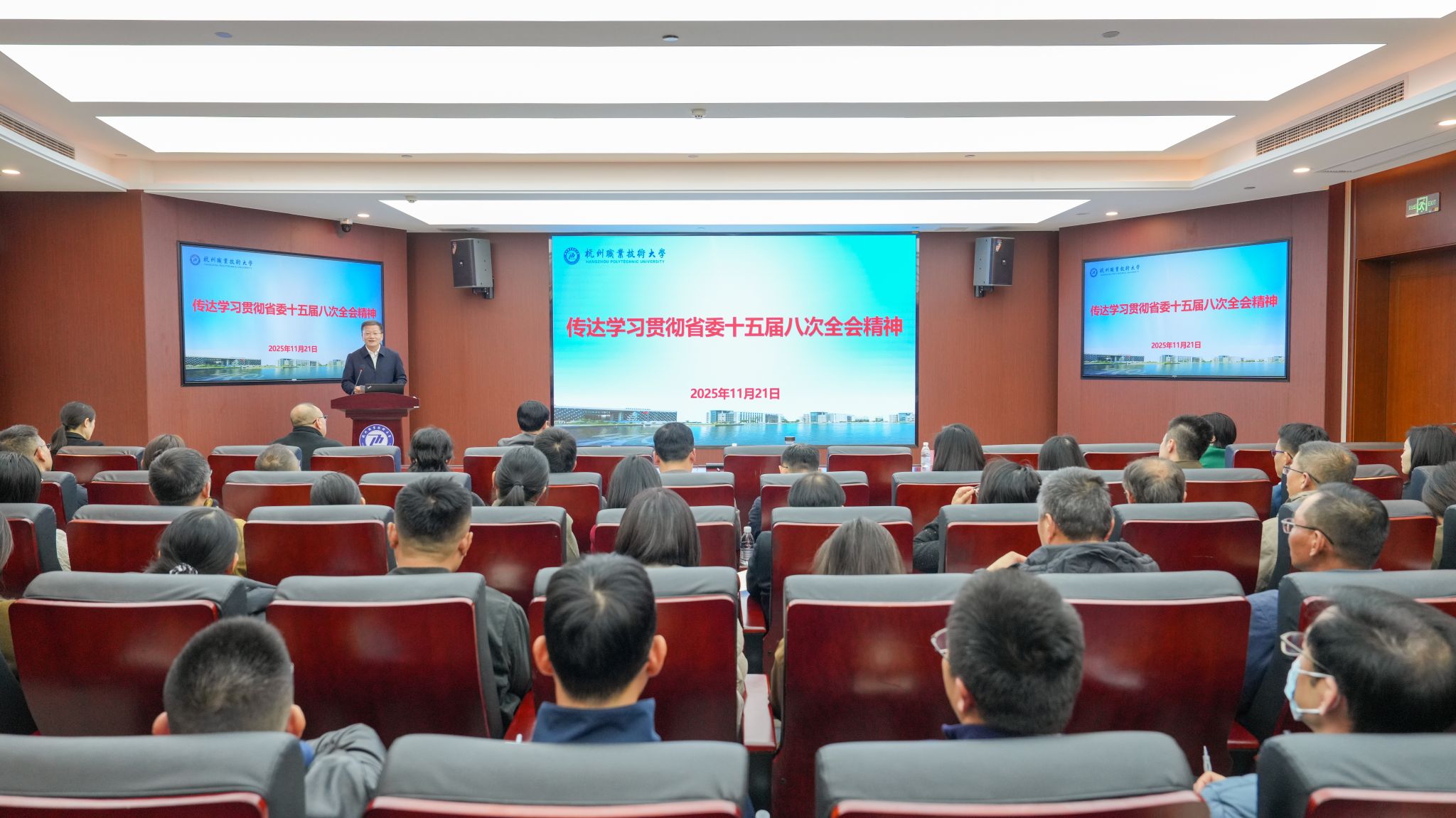 会议指出,省委十五届八次全会是在全省上下深入学习贯彻党的二十届四中全会精神,迈向基本实现社会主义现代化关键时期召开的一次十分重要的会议,意义重大、影响深远。大会全面总结了我省“十四五”发展取得的重大成就,系统部署了“十五五”时期各项重点发展任务,鲜明提出了“十五五”时期“高质量发展建设共同富裕示范区取得决定性进展,率先呈现基本实现社会主义现代化生动图景”的总目标,为我省深入践行“八八战略”,高质量发展建设共同富裕示范区、助力浙江打造“重要窗口”提供了行动指南,为全省未来一个时期的发展指明了方向,更为学校准确把握新发展阶段历史机遇、推动事业发展提档升级提供了目标指引。