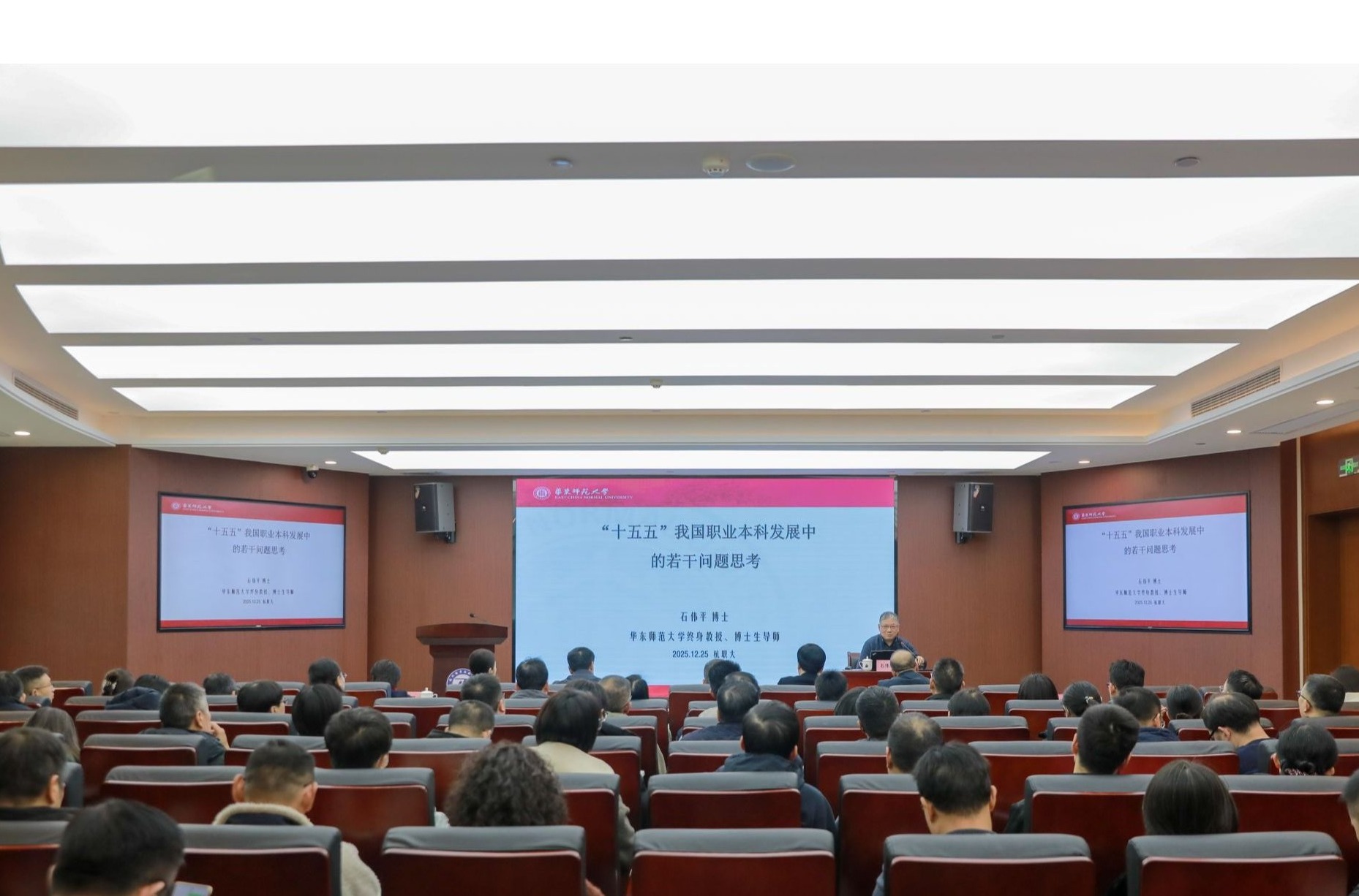 为更好把握高水平职业本科学校建设新形势新要求,科学推进学校“十五五”事业发展,12月25日下午,学校召开第三次“十五五”发展论坛,特别邀请我国职业技术教育学专业的第一位博士生导师、华东师范大学终身教授石伟平教授来校做专题辅导报告。会议由学校党委书记陈文岳主持,校领导班子成员,全体中层干部,各党支部书记,第二期“菁英计划”人员等参加本次发展论坛。