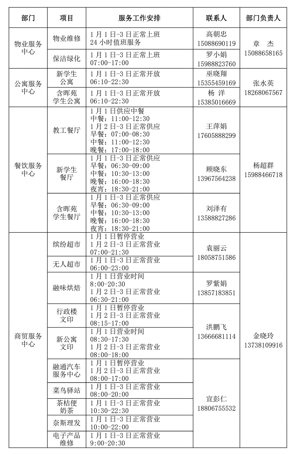 根据学校元旦放假安排,为确保学校后勤服务工作平稳有序运行,现将元旦期间后勤服务中心、资产公司服务工作安排通知如下:
