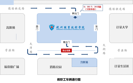 3.学源街(由西向东方向)南门红绿灯处禁止车辆左转进入南门,车辆由学源街文溯路口红绿灯处调头后由东向西到达南门区域。
