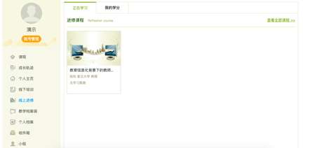 PC端报名学习:进入个人空间后,在页面左边栏,点击“线上进修”后,查看全部课程,再进行课程选择报名学习。