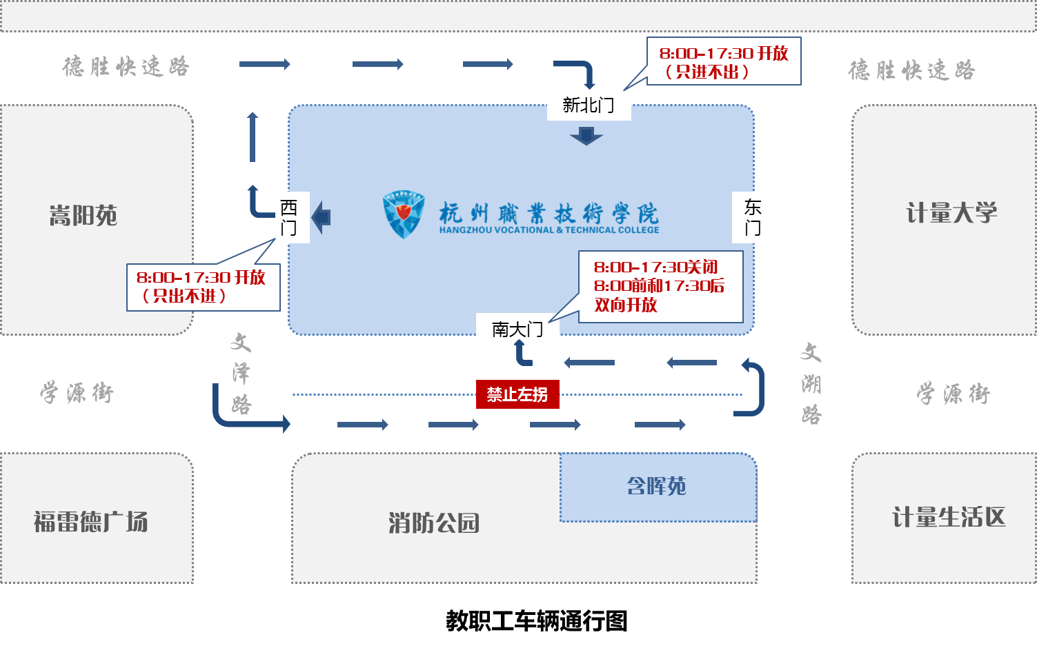 3.西门(文泽路)8:00-17:30开放,机动车、电动车只出不进。