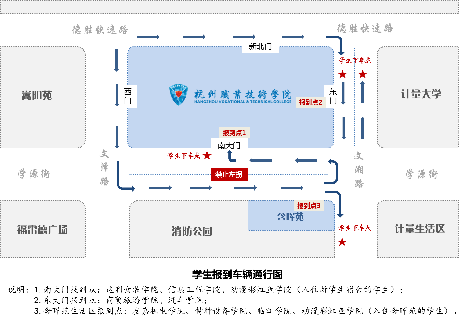 2.南门报到点车辆可在学源街慢车道(南门区域)临时下客,即停即走。