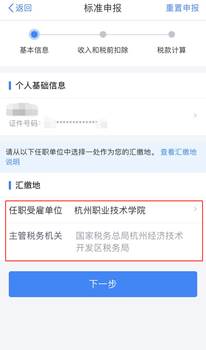(2)任职受雇单位为“杭州职业技术学院”(如2019年有多个任职受雇单位需选择一处作为汇缴地),点击“下一步”。