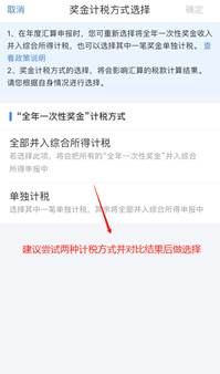 提示:①在收入-工资薪金中对于奖金有不同的计税方式:全部并入综合所得计税和单独计税,选择不同的计税方式会影响汇算税款的计算结果。(建议在未提交申报前尝试不同的计税方式并对比其计税结果后再作选择)