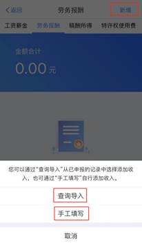 ②关于收入-劳务报酬、稿酬等的填报:普通劳务报酬和稿酬收入需自行添加或者查询导入。以“劳务报酬”为例,点击劳务报酬右侧“>”进入劳务报酬界面,点击右上角“新增”,可以选择“查询导入”或者“手工填写”自己的劳务报酬。