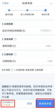 ②如汇缴需补税但满足免予汇算条件,则在税款计算后点击“享受免申报”,即无需缴纳税款。