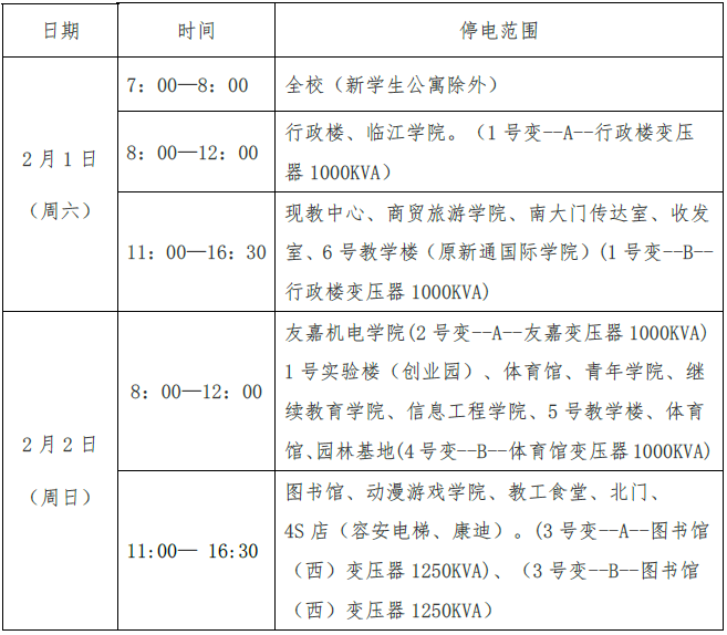 因学院图书馆、1、2、3、4号变压器检修,须作停电处理,具体安排如下:
