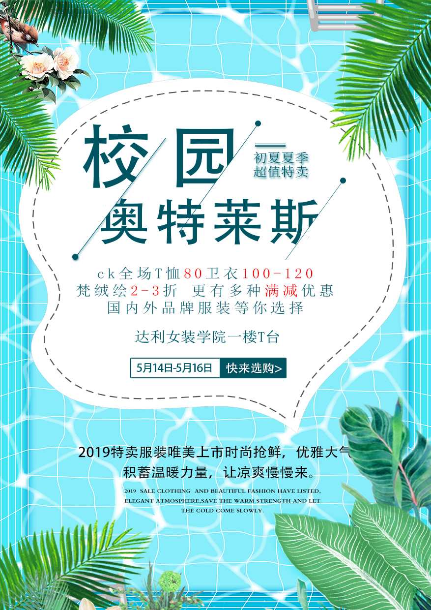 达利女装学院服装设计与工艺专业(时装零售与管理方向)将于5月14日----5月16日结合学生服装特卖课程实训项目,组织梵绒绘女装、CK男装和多个男装品牌开展联合特卖活动。具体安排如下: