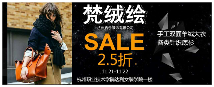 11月21日—22日期间,梵绒绘——杭州启乐服饰有限公司自营品,来校开展特卖活动。梵绒绘主营双面羊绒大衣和各类针织服装。定位中高端私人订制会所。品牌的质量,工厂的价格。梵绒绘打造让人人都买的起的奢侈品质。