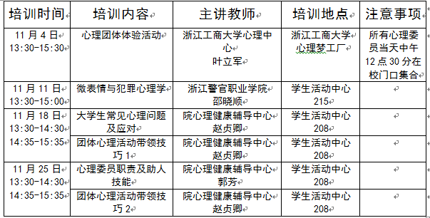 为进一步加强我院大学生心理健康教育工作,促进班级心理委员队伍建设,帮助班级心理委员增强责任意识,明确工作职责,提高业务水平,人文社科部、心理健康辅导中心将于11月每周三下午对全院所有2015届班级心理委员进行专业系统培训。届时,院心理健康辅导中心将通过讲座、室内团体辅导和户外团体心理体验活动等形式开展丰富多彩的班级心理委员培训。同时,为深化培训效果,院心理健康辅导中心还积极采取了“请进来,走出去”的方法,将外校的名家请来学校为心理委员们做讲座;将本校的心理委员们带到外校去学习别校的先进经验。相信经过这次的系列培训,定能切实提高2015级班级心理委员助人自助的能力,继续为我院心理健康工作添砖加瓦。