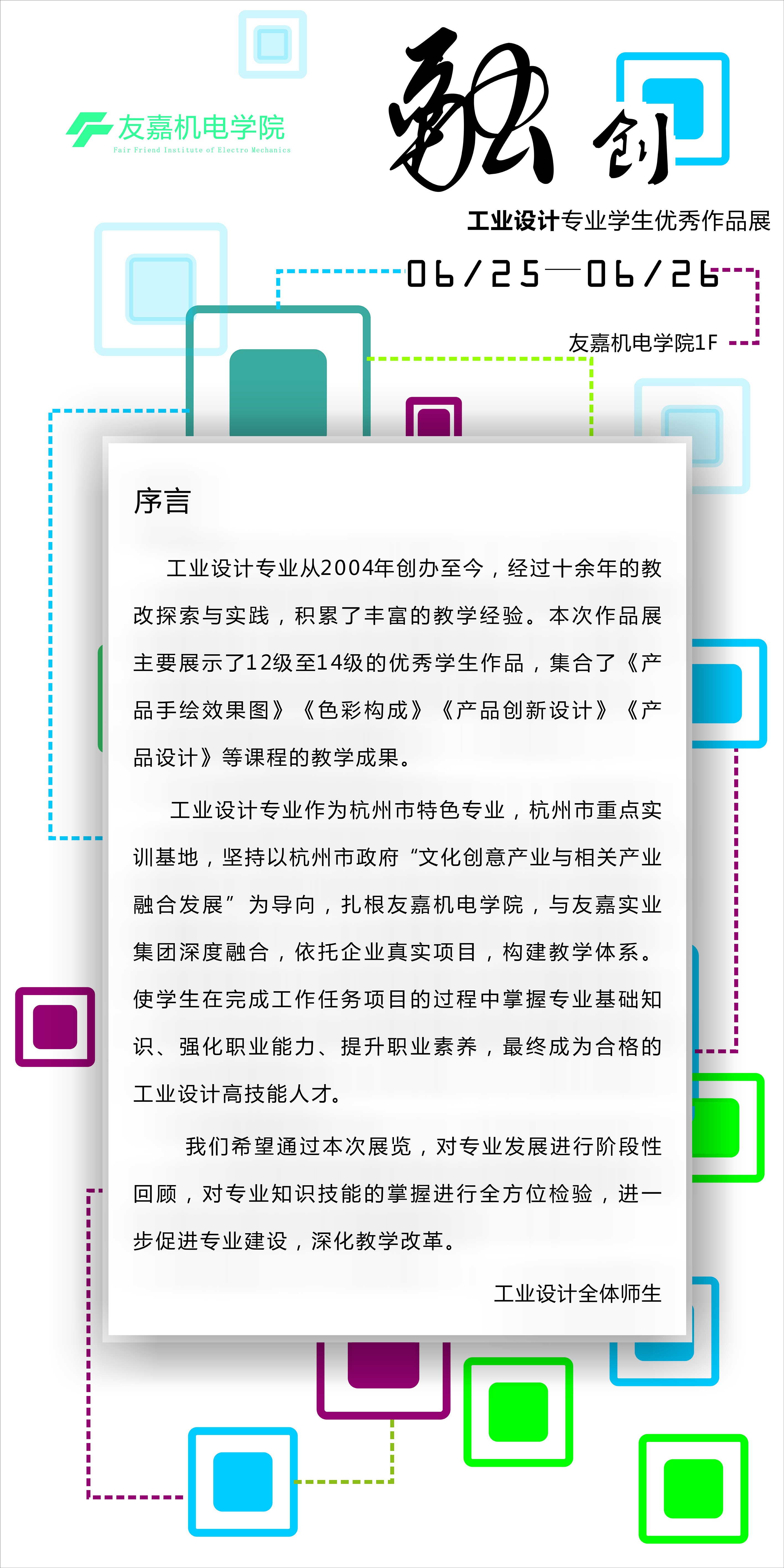 经过近半个学期的精心筹划和准备,友嘉机电学院工业设计专业学生的优秀作品展如期开幕啦。诚邀广大师生莅临指导。