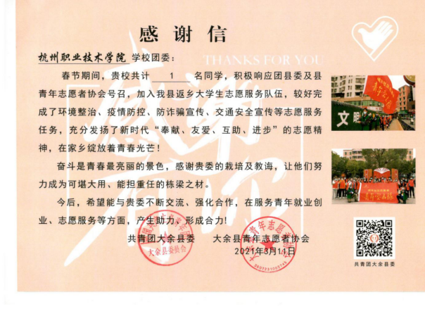 3月22日,我校收到共青团大余县委感谢信。据了解,寒假期间,信息工程学院应电2011龚纪杰在家乡新城镇樟树下村协助社区干部走访农户,调查各户房屋信息及存在的安全隐患,并将其录入系统上报政府。通过实地走访,排除每处隐患,使居民的住房安全得到基础保障,为社区组织的规范化、制度化、经常化发展增添一份力量。共青团大余县委对龚纪杰颁发感谢信,以此感谢他在假期中积极响应团县委及青年志愿者的号召,肯定他为志愿服务工作付出的努力。